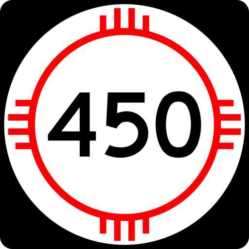 Keywords: New Mexico 450.svg 750 mm by 750 mm 30 in by 30 in New Mexico state road shield made to the specifications of the http //nmshtd state nm us/upload/images/Plans_Specs_Estimates/Division 20700/701/701 pdf PS E Standard Drawings which specifies a 30 by 30 shield for 3-digit roads Pictures of actual shields were also used for reference Uses the Roadgeek 2005 fonts United States law does not permit the copyrighting of typeface designs and the fonts are meant to be copies of a U S Government-produced work anyway self-created using Inkscape and Image New Mexico 3di svg 2008-03-26 Mr Matté Own work all rights released Public domain New Mexico State Road shields Shields created by User Mr Matté |