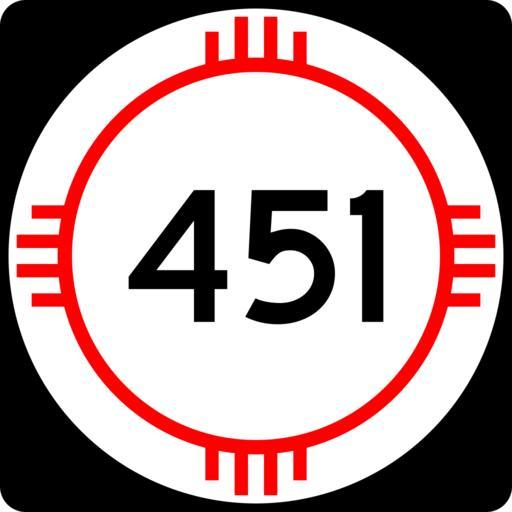 Keywords: New Mexico 451.svg 750 mm by 750 mm 30 in by 30 in New Mexico state road shield made to the specifications of the http //nmshtd state nm us/upload/images/Plans_Specs_Estimates/Division 20700/701/701 pdf PS E Standard Drawings which specifies a 30 by 30 shield for 3-digit roads Pictures of actual shields were also used for reference Uses the Roadgeek 2005 fonts United States law does not permit the copyrighting of typeface designs and the fonts are meant to be copies of a U S Government-produced work anyway self-created using Inkscape and Image New Mexico 3di svg 2008-03-26 Mr Matté Own work all rights released Public domain New Mexico State Road shields Shields created by User Mr Matté |