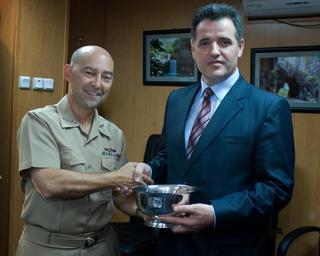 | Keywords: New SACEUR makes first visit to Kosovo DVIDS461464.jpg en Adm James Stavridis supreme allied commander europe today travelled to Pristina Kosovo to meet with Kosovo Security Force Minister Fehmi Mujota commander of NATO's Kosovo Force; Lt Gen Giuseppe Emilio Gay; and KFOR Multinational Task Forces commanders Stavridis took the opportunity to discuss the current Kosovo security situation NATO's recent decision to reduce the profile of NATO forces in Kosovo the KSF training and recruiting progress training resources and equipment requirements as well as the current status of the EULEX deployment I am very satisfied with the latest developments in Kosovo The NAC decision to further reduce the profile of NATO forces in Kosovo is a clear indication of confidence in local capacity capability and responsibility The government of Kosovo is steadily taking on more and more of the responsibility for ensuring the rule of law and governance of the Kosovo population said Stavridis after meeting with Minister Mujota NATO will remain committed to promoting peace stability prosperity and respect for human rights in the region Our goal is to see the responsibility for maintaining peace shift to the local population and institutions further emphasized Stavridis Addressing MNTF commanders Stavridis said The progress NATO achieved in Kosovo is significant and KFOR's move toward Deterrent Presence is a sign of the Alliance's confidence in the progress made It allows NATO to adopt a new force structure concept reducing the number of troops deployed in Kosovo Stavridis continued During his Kosovo visit Stavridis also visited Gazimestan monument the site of the Battle of Kosovo which took place in 1389 and Sultan Murad's Tomb It was Admiral's Stavridis first visit in Kosovo since assuming his post as Supreme Commander Allied Powers Europe commander of NATO's Allied Command Operations earlier this month Stavridis presents a gift to Mr Mujota minister Kosovo Security Forces during his first visit 2009-07-29 left https //www dvidshub net/image/461464 090729-D-+++++-149 2011-09-23 12 50 PRISTINA ZZ PD-USGov James Stavridis Images from DoD uploaded by Fæ |