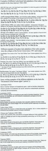 | Keywords: New Turkic alphabets.jpg badJPEG New Turkic alphabets svg Dieses Bild zeigt verschiedene lateinisch-basierte Alphabete sogenanntes Einheitliches Alphabet der Turkvölker in den frühen 1920er Jahren bis zu deren Ablösung durch russisch-basierte Kyrillaphabete ab 1938/40 Daneben werden einige moderne turkvölkische Alphabete sogenannte neue türkische Alphabete angeführt die sich vom modernen Lateinalphabet der Türkei ableiten Hinweise/Notes Die verschiedenen Lateinalphabete wurden zwischen 1938 und 1940 im Zuge des verstärkten Russisch-Unterrichtes bei den nichtslawischen Völkern Rußlands durch modifizierte Alphabete kyrillischen Ursprungs ersetzt War bei den Lateinalphabeten noch die gegenseitige Lesbarkeit erstrebt worden so wurde diese durch die völlig unterschiedlichen Bedeutungen verschiedener kyrillischer Buchstaben durch die Sowjetregierung bewußt erschwert Nach dem Zusammenbruch der UdSSR ab 1989 wurde von Aserbaidschan im Jahre 1991 die Rückkehr zum lateinischen Alphabet beschlossen Dieses Alphabet war dem modernen der Türkei nachempfunden und unterschied sich nur durch drei Sonderzeichen »ä« »x« und »q« vom türkischen Alphabet Diese Sonderzeichen sollten »rein aserbaidschan-türkische« Laute kennzeichen Am 30 Oktober 1992 wurde in der türkischen Hauptstadt Ankara im Zuge der neugegründeten »Schwarzmeer-Kooperation« KEI die OATCT türkisch Orta Asya Türk Cumhuriyetleri Toplantısı Zentralasiengipfel der Turkrepubliken gegründet Diese beschloß auf diesem Gipfel daß ein gemeinsames »türkisches Alphabet« die Entwicklung eines gemeinsamen Grundwortschatzes und die Anlehnung der Rechtschreibung der jeweiligen Staatssprachen an das moderne Türkeitürkische zu erfolgen hatte Ferner sollten die großen Turkstaaten Aserbaidschan Kasachstan Kirgisistan Turkmenien und Usbekistan bis zum Jahre 2005 ein türkisch-lateinisches Alphabet für ihre Staatssprachen eingeführt haben Für die türkischen Minderheiten in den benachbarten Ländern vor allem in Syrien Irak und dem Iran und in der Russischen Föderation wurde eine Einführung des lateinischen Alphabetes auf das Jahr 2010 angesetzt Am 22 Dezember desselben Jahres beschloß der aserbaidschanische Nationalrat »Türkisch« als alleinige Amtssprache und damit verbunden das »neue aserbaidschanische Alphabet« zur Schreibung der Landessprache einzuführen Im Zuge dieser Einführung wurde der Sonderbuchstabe »ä« durch das heutige Zeichen »ə« ersetzt Diese aserbaidschanischen Lateinalphabete übernahmen auch die aserbaidschanischstämmige Minderheit im Iran So wird das moderne Aserbaidschan-Alphabet nun auch inoffiziell und parallel zur Schreibung des Türkischen im Iran benutzt So wird beispielsweise die Zeitschrift »Varliq« seit her in lateinischen Buchstaben gedruckt und vertrieben Im Jahre 1994 wurde das Musteralphabet türkisch Ortak türk Alfabesi gemeinschaftliches türkisches Alphabet der Öffentlichkeit vorgestellt und es wurde in der Türkei auch unter der Bezeichnung »Öz alfabe« unser Alphabet bekannt da sich dieses Musteralphabet mit seinen zahlreichen Zusatzzeichen aus diesem herleiteten Aus diesem Alphabet sind ursprünglich alle Lateinalphabete Zentralasiens abgeleitet; auch Usbekistan und Turkmenistan entwickelten ihre Lateinalphabete aus diesem Musteralphabet Doch diese beiden Staaten gingen schließlich eigene Wege da sie nun “ eine Vorherrschaft Ankaras in Zentralasien vermuteten “ völlig eigenständige Alphabete entwickelten Im Jahre 2000 wurde auch von der tatarischen Regionalregierung in Kasan die Einführung eines Lateinalphabetes beschlossen Dieses geschah als Reaktion darauf daß das russische Parlament im selben Jahr den Beschluß gefaßt hatte daß es in der russischen Föderation nur eine Schriftart zu geben habe das kyrillische Auch übernahmen in diesem Jahr die meisten türkischen Minderheiten des Iran das moderne aserbaidschanische Lateinalphabet zur Schreibung ihrer Sprachen Diese à bernahme war natürlich inoffiziell doch nehmen es momentan alle Regierungsstellen des Iran stillschweigend hin Die türkische Minderheiten Syriens und des Iraks haben zwischenzeitlich die türkische Hoch- und Schriftsprache der Türkei angenommen This picture shows different Latin-based alphabets so-called uniform alphabet of the Turkic peoples from the early 1920s up to their replacement by Russian-based Cyrillic alphabets starting from 1938/40 Some modern Turkic alphabets so-called new Turkic alphabets are given as well which are derived from the modern Latin alphabet of Turkey The different Latin alphabets were replaced by modified alphabets of Cyrillic origin between 1938 and 1940 in the course of intensified instruction of the non-Slavic peoples of Russia in the Russian language Although the Latin alphabets were devised for mutual legibility the Soviet government consciously made it more difficult because of the completely different meanings of different Cyrillic letters After the collapse of the USSR starting from 1989 it was decided by Azerbaijan in the year 1991 to return to the Latin alphabet This alphabet was shared by modern Turkey and differed from the Turkish alphabet only in having three special characters ä x and q These special characters represented purely Azerbaijan-Turkish sounds On October 30 1992 in the Turkish capital Ankara the OATCT Turkish Orta Asya Türk Cumhuriyetleri Toplantısı central Asia summits of the Turkic Republics was created as a result of the newly created Black Sea Co-operation KEI At this summit it was decided that a common Turkish alphabet had to be devised to which the modern Turkish language would be used as a basis for development of a common basic vocabulary and the orthography of the respective state languages Furthermore the large Turkic-language speaking countries of Azerbaijan Kazakhstan Kirgizistan Turkmenistan and Uzbekistan should have the Turkish Latin alphabet introduced for their state languages by the year 2005 