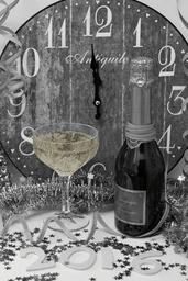 Keywords: new year's eve new year's greetings clock champagne new year abut drink alcohol celebrate festival sparkling wine bottle champagne bottles champagne glasses prost alcoholic benefit from unopened just before twelve black and white party celebration streamer