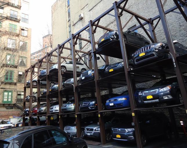 Keywords: New York City parking lot structure for cars.JPG en Vertical parking structure on a small lot in Manhattan 2014-01-19 03 00 02 own Tomwsulcer cc-zero Uploaded with UploadWizard Parking garages in New York Parked automobiles