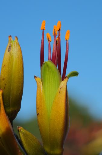 Keywords: New Zealand flax flower against blue sky (Phormium tenax).jpg New Zealand flax flower Phormium tenax its pollen-laden stamens contrasting against the blue sky Own 2015-12-27 Pseudopanax wikipedia en Phormium tenax Stamens Taken with Fujifilm X-Pro1