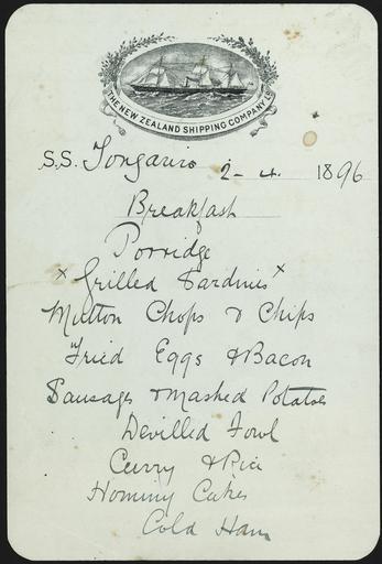 | Keywords: text writing sketch drawing document Menu lists porridge, grilled sardines, mutton chops & chips, fried eggs & bacon, sausages & mashed potatoes, devilled fowl, curry & rice, hominy cakes, and cold ham. At the top is a small portrait of a steam and sailing ship in an oval inset. Quantity: 1 b&w photo-mechanical print(s) and holograph on menu.. Physical Description: Ink and engraving on blue sheet, 165 x 110 mm. Provenance: Purchased from Cavendish Philatelic Auction, Derby, in November 1998. New Zealand Shipping Company :S.S. "Tongariro". Breakfast [menu]. 2.4.1896.. Ref: Eph-A-SHIP-1896-02. Alexander Turnbull Library, Wellington, New Zealand. natlib.govt.nz/records/22885135 Menu lists porridge, grilled sardines, mutton chops & chips, fried eggs & bacon, sausages & mashed potatoes, devilled fowl, curry & rice, hominy cakes, and cold ham. At the top is a small portrait of a steam and sailing ship in an oval inset. Quantity: 1 b&w photo-mechanical print(s) and holograph on menu.. Physical Description: Ink and engraving on blue sheet, 165 x 110 mm. Provenance: Purchased from Cavendish Philatelic Auction, Derby, in November 1998. New Zealand Shipping Company :S.S. "Tongariro". Breakfast [menu]. 2.4.1896.. Ref: Eph-A-SHIP-1896-02. Alexander Turnbull Library, Wellington, New Zealand. natlib.govt.nz/records/22885135 |
