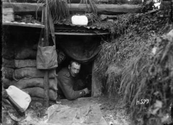 Keywords: blackandwhite monochrome black and white Two soldiers look out of a dugout at the front line, Hebuterne in France. A close up view of the entrance with sandbags and corrugated iron roof prominent. Photograph taken 13 May 1918 by Henry Armytage Sanders. Inscriptions: Inscribed - Photographer's title on negative -bottom right: H577. Quantity: 1 b&w original negative(s). Physical Description: Dry plate glass negative 4.75 x 6.5 inches New Zealand soldiers looking out of a dugout during World War I, Hebuterne. Royal New Zealand Returned and Services' Association :New Zealand official negatives, World War 1914-1918. Ref: 1/2-013190-G. Alexander Turnbull Library, Wellington, New Zealand. natlib.govt.nz/records/23104990 Two soldiers look out of a dugout at the front line, Hebuterne in France. A close up view of the entrance with sandbags and corrugated iron roof prominent. Photograph taken 13 May 1918 by Henry Armytage Sanders. Inscriptions: Inscribed - Photographer's title on negative -bottom right: H577. Quantity: 1 b&w original negative(s). Physical Description: Dry plate glass negative 4.75 x 6.5 inches New Zealand soldiers looking out of a dugout during World War I, Hebuterne. Royal New Zealand Returned and Services' Association :New Zealand official negatives, World War 1914-1918. Ref: 1/2-013190-G. Alexander Turnbull Library, Wellington, New Zealand. natlib.govt.nz/records/23104990 |