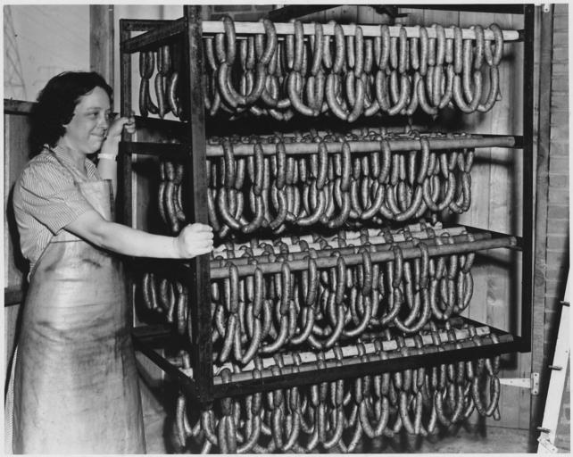 | Keywords: Newberry County, South Carolina. Scene in the sausage room at the P and M Packing Company. Each fra . . . - NARA - 522689.jpg Scope and content Full caption reads as follows Newberry County South Carolina Scene in the sausage room at the P and M Packing Company Each frame as shown here holds 150 lbs of sausage Sausage made at this plant is sold in Newberry and surrounding towns General notes 522689 Local identifier 83-G-44569 Department of Agriculture Bureau of Agricultural Economics Division of Economic Information ca 1922 - ca 1953 Still Picture Records Section Special Media Archives Services Division NWCS-S National Archives at College Park 8601 Adelphi Road College Park MD 20740-6001 04/1941 Record group Record Group 83 Records of the Bureau of Agricultural Economics 1876 - 1959 Record group ARC 412 Photographic Prints Documenting Programs and Activities of the Bureau of Agricultural Economics and Predecessor Agencies compiled ca 1922 - ca 1947 documenting the period ca 1911 - ca 1947 Series ARC 521048 File unit File unit ARC Variant control numbers NAIL Control Number NWDNS-83-G-44569 Other versions <gallery> File Newberry_County _South_Carolina _Scene_in_the_sausage_room_at_the_P_and_M_Packing_Company _Each_fra_ _ _ _-_NARA_-_522689 tif tif File Newberry_County _South_Carolina _Scene_in_the_sausage_room_at_the_P_and_M_Packing_Company _Each_fra_ _ _ _-_NARA_-_522689 jpg jpg </gallery> NARA-cooperation PD-USGov 1941 in Newberry County |