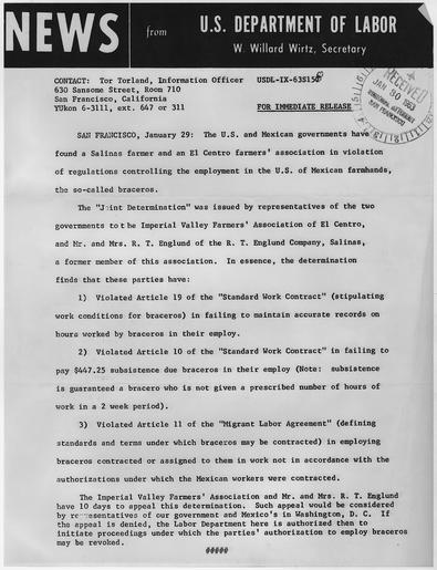 | Keywords: News from U.S. Department of Labor regarding findings of violation against Imperial Valley Farmers' Association and... - NARA - 296738.tif Scope and content This document is related to the Bracero Program a federally sponsored labor program during the 1950s-early 1960's whereby migrant/migratory laborers from Mexico were provided for seasonal mostly agricultural employment often on the farms of Californa growers The document provides insight into Hispanic/Latino/Mexican immigration and labor history including controversies which surfaced during the farm labor movement of the years thereafter General notes 296738 Local identifier Department of Labor Office of the Solicitor Region 9 San Francisco Office of the Regional Attorney 1965 - 1973 NARA's Pacific Region San Bruno NRHAS 1000 Commodore Drive San Bruno CA 94066-2350 1963-01-29 Record group Record Group 174 General Records of the Department of Labor 1907 - 2001 Record group ARC 503 Records Relating to the Mexican Labor Bracero Program compiled 1950 - 1964 Series ARC 296723 File unit R T Englund Co El Centro Elizabeth A Longebohn charges 1962 - 1963 File unit ARC 296731 Variant control numbers NAIL Control Number NRHS-174-REG9BRACERO-ENGLUND-7 yes Other versions NARA-cooperation PD-USGov Immigration to the United States from Mexico Law enforcement in the United States 1963 documents Agriculture in the United States Mexican Americans |