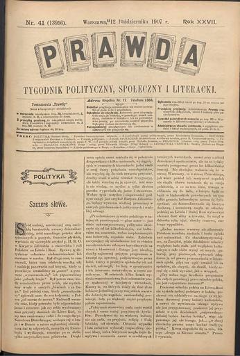 | Keywords: Newspaper Prawda - nr 41 - 1907 AD.jpg  en newspaper Prawda 41 1907 AD Warszawa city Russian empire page 1 ru ва шавская польскоязычная газета Prawda 41 1907 г Российская импе ия ст аница 1 be ва шаўская польскамоўная газета Prawda 41 1907 г Расійская імпе ыя ста онка 1 newspaper Prawda 41 1907 AD Warszawa city Russian empire page 1 editor Paulina Sieroszewska 1907 public domain in Poland PD-Polish газета П авда польская жу налістыка польскі д ук Newspapers of the Russian Empire Newspapers of Poland Kovno Governorate 1907 newspapers October 1907 in Poland PD-old |