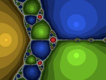 Keywords: Newton-Fractal 2z3-2z+2.png Newton fractal for the polynomial <math>f z\mapsto z 3-2z+2</math> in the range -2 2 × -1 5 1 5<math>i</math> Numbers in the orange green and blue basins converge to zeros of <math>f</math> numbers in the red basins are attracted by the attractive cycle <math>\ 0 1\ </math> i e they do not converge to a zero of <math>f</math> The white structure is the Newton fractal for <math>f</math> i e it is the Julia set <math>J</math> for the meromorphic function <math>g z\mapsto z-\frac f z f' z 2\frac z 3-1 3z 2-2 </math> Zeros of <math>f</math> are attractive fixpoints of <math>g</math> Moreover 1 and 0 are fixpoints of <math>g\circ g</math> but not of <math>g</math> The set <math>J</math> has the following properties its interior is empty it is closed <math>\ J \ \mathbb R </math> <math>J</math> is connected <math>J \partial B_\mathrm red \partial B_\mathrm orange \partial B_\mathrm blue \partial B_\mathrm green </math> where <math>\partial B</math> denotes the border of a basin This means that every point in <math>J</math> is a 4-corner point own 2008-03-20 Georg-Johann Lay thumb Closeup using the same color map Newton fractals |