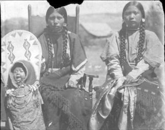 Keywords: NezPerceFemmes.jpg Nez Perce women and child in cradleboard Notes Two women sit beside a baby in a cradleboard The woman on the left is the first wife of Willie Red Star Andrew She wears a belted tunic over a checkered blouse and a blanket wrapped around her legs The woman on the left is Anne Kamiakin George's mother She wears similar clothing to the other woman but she hold in hands a silken cloth The baby in cradleboard is unidentified Northwest Museum of Arts and Culture unknown author PD-USGov Nez Perce Cradle boards |