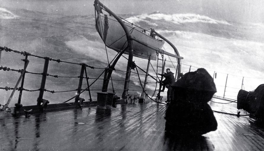 | Keywords: blackandwhite monochrome outdoor black and white NH 101060.  "Quarter Deck Seas"  View looking aft on the main deck of USS Vermont (Battleship # 20), while she was steaming in heavy seas during the Nineteen "teens".  Note man standing by the ladder leading to the quarterdeck whaleboat.  Photograph by N. Moser, New York.  From the album of Francis Sargent; Courtesy of Commander John Condon, 1986.  NHHC Photograph Collection.  (The Sailor). NH 101060.  "Quarter Deck Seas"  View looking aft on the main deck of USS Vermont (Battleship # 20), while she was steaming in heavy seas during the Nineteen "teens".  Note man standing by the ladder leading to the quarterdeck whaleboat.  Photograph by N. Moser, New York.  From the album of Francis Sargent; Courtesy of Commander John Condon, 1986.  NHHC Photograph Collection.  (The Sailor). |