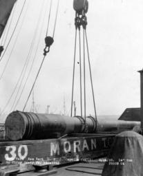 | Keywords: blackandwhite monochrome outdoor black and white NH 42061:  Army 16" gun, Model 1919.  On board Moran Towing Co. Barge No. 30 on 26 September 1922 in a sling ready to be lifted onto the after deck of USS Capella (AK-13). This was the second of two guns loaded aboard Capella for shipment to Pearl Harbor. Official U.S. Navy Photograph, from the collections of the Naval History and Heritage Command. NH 42061:  Army 16" gun, Model 1919.  On board Moran Towing Co. Barge No. 30 on 26 September 1922 in a sling ready to be lifted onto the after deck of USS Capella (AK-13). This was the second of two guns loaded aboard Capella for shipment to Pearl Harbor. Official U.S. Navy Photograph, from the collections of the Naval History and Heritage Command.  |