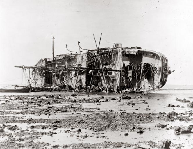 | Keywords: outdoor monochrome NH 42288:  German Gunboat Adler.  Overturned on the reef, on the western side of Apia Harbor, Upolu, Samoa, during salvage work after the storm.  Note the gun mounted on her poop deck, and bent propeller shaft visible at her stern. Naval History and Heritage Command Photograph.  (2016/01/03).   NH 42288:  German Gunboat Adler.  Overturned on the reef, on the western side of Apia Harbor, Upolu, Samoa, during salvage work after the storm.  Note the gun mounted on her poop deck, and bent propeller shaft visible at her stern. Naval History and Heritage Command Photograph.  (2016/01/03). |
