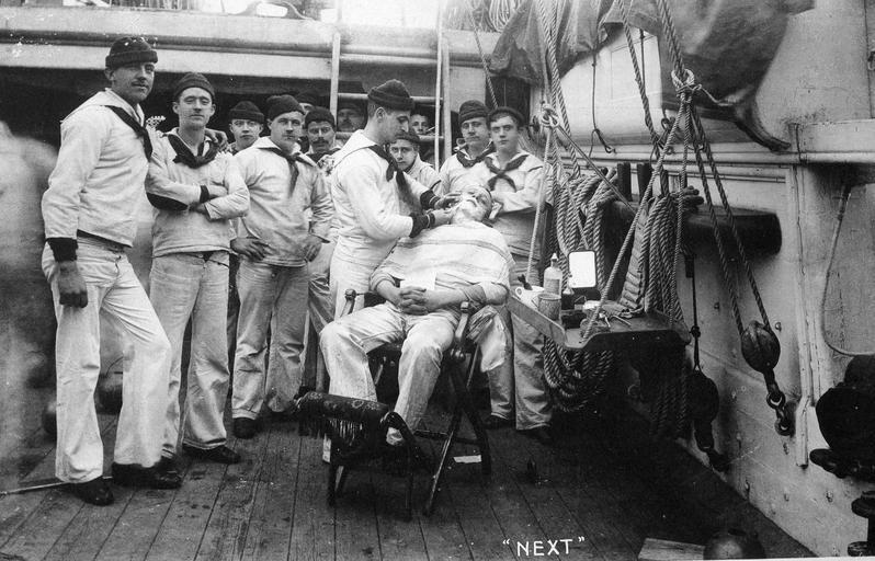 Keywords: blackandwhite monochrome black and white NH 51048: USS Enterprise (1877-1909). "Next": The ship's barber shaving another crewman, probably while the ship was at the New York Navy Yard, circa spring 1890. Photographed by E.H. Hart, New York City. Note barber's folding chair, and his tray suspended from the rigging. NHHC Photograph Collection. NH 51048: USS Enterprise (1877-1909). "Next": The ship's barber shaving another crewman, probably while the ship was at the New York Navy Yard, circa spring 1890. Photographed by E.H. Hart, New York City. Note barber's folding chair, and his tray suspended from the rigging. NHHC Photograph Collection. |