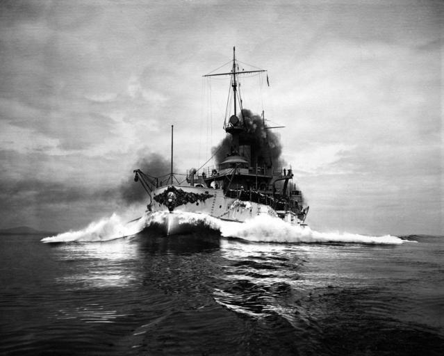 MAKE A MEME View Large Image Connecticut (BB-1) Running speed trials off the Maine coast, 1906. Photographed by Enrique Muller. Note sailors crowding the rails, watching the photographer's boat, which is about to be swamped by the battleship's bow wave. U.S. Naval ...