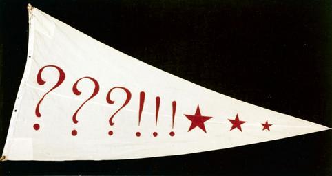 Keywords: text sign NH 92737-KN (Color) : "What-the-Hell!" pennant. Used by Naval Group China, during World War II. (Legend written in the pennant's hem, front side): "This pennant was hoisted on 4 September 1945 on the Glen Line Building when that building was captured by the Naval Group China. The U.S. Flag, Chinese Flag and Rear Admiral M.E. Miles' personal flag were hoisted first by Lt. Comdr. Webb Heagy and Lt. S.I. Morris in order to signal the success of the operation." (Legend written in the pennant's hem, back side): "This is an exact copy of the original 'What-the-Hell' pennant which was made on board the USS Wickes (DD-75), Lt. Cdr. R.U. Hyde '17, Commanding, and Lt. M.E. Miles, Exec. - August 1934. The original was carried by its designer to the USS John D. Edwards (DD-216) and used in China by Lt. Cdr. M.E. Miles when his ship was ordered to Hainen Island to witness that island's capture on 14 Feb. 1939. See account in 'Saturday Evening Post', Nov. 10, 1945. This insignia used as shoulder patch by U.S. Naval Group China as a shipping designator for SACO supplies in China, 1942-1945. This pennant presented to Rear Admiral M.E. Miles at Shanghai, 4 September 1945 at # 2 Peking Road." Collection of Vice Admiral Milton E. Miles, USN. U.S. Naval History and Heritage Command Photograph. (2015/12/27) NH 92737-KN (Color) : "What-the-Hell!" pennant. Used by Naval Group China, during World War II. (Legend written in the pennant's hem, front side): "This pennant was hoisted on 4 September 1945 on the Glen Line Building when that building was captured by the Naval Group China. The U.S. Flag, Chinese Flag and Rear Admiral M.E. Miles' personal flag were hoisted first by Lt. Comdr. Webb Heagy and Lt. S.I. Morris in order to signal the success of the operation." (Legend written in the pennant's hem, back side): "This is an exact copy of the original 'What-the-Hell' pennant which was made on board the USS Wickes (DD-75), Lt. Cdr. R.U. Hyde '17, Commanding, and Lt. M.E. Miles, Exec. - August 1934. The original was carried by its designer to the USS John D. Edwards (DD-216) and used in China by Lt. Cdr. M.E. Miles when his ship was ordered to Hainen Island to witness that island's capture on 14 Feb. 1939. See account in 'Saturday Evening Post', Nov. 10, 1945. This insignia used as shoulder patch by U.S. Naval Group China as a shipping designator for SACO supplies in China, 1942-1945. This pennant presented to Rear Admiral M.E. Miles at Shanghai, 4 September 1945 at # 2 Peking Road." Collection of Vice Admiral Milton E. Miles, USN. U.S. Naval History and Heritage Command Photograph. (2015/12/27) |