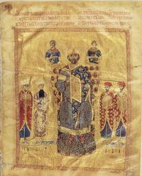 | Keywords: Nicephorus III and officers BnF Coislin79 fol2.jpg The Byzantine emperor Nicephorus III or possibly Michael VII and the chief four officials of his court From left the proedros and epi tou kanikleiou the eunuch prōtoproedros and prōtovestiarios the emperor flanked by Truth and Justice the proedros and dekanos and the proedros and megas primikērios Ο αυτοκράτορας ικηφόρος Γ' Βοτανειάτης ή ίσως ο ιχαήλ Ζ' με τους τέσσερις ε ικεφαλής αυλικούς του Α ό αριστερά ο ρόεδρος και ε ί του κανικλείου ο ευνούχος ρωτο ρόεδρος και ρωτοβεστιάριος ο αυτοκράτωρ με τις αλληγορικές αραστάσεις της Αλήθειας και της Δικαιοσύνης ο ρόεδρος και δεκανός και ο ρόεδρος και μέγας ριμικήριος L'empereur Nicéphore III et ses courtiers Bibliothèque nationale de France Manuscript Coislin 79 folio 2 between 1074 1081 in Homélies de Jean Chrysostome John Chrysostom Homilies PD-old Coislin 79 2 <gallery> File NicephorusOrMichaelBnFCoislin79Fol2 jpg </gallery> Bibliothèque nationale de France Manuscript Coislin 79 Nicephorus 2 Nicephorus III Michael VII Doukas Medieval miniatures of Byzantine emperors Coislin 2 Byzantine chlamys Byzantine textiles checked |