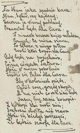 Keywords: Nie dbam jaka spadnie kara….jpg ru Nie dbam jaka spadnie kara - песня изгнанников От ывок из поэмы Адама ицкевича Дзяды 1860-ые гг Автог аф К С Кост овицкого а польском языке 2013-06-03 11 36 16 http //archives gov by/index php id 136859 Karuś Kahaniec Custom license marker 2013 06 03 PD-old Uploaded with UploadWizard Karuś Kahaniec Dziady January Uprising 1860s documents |