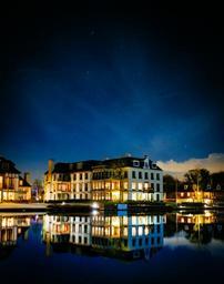 Keywords: night water building reflection house city architecture illumination glassy lake tranquil calm cityscape scenery