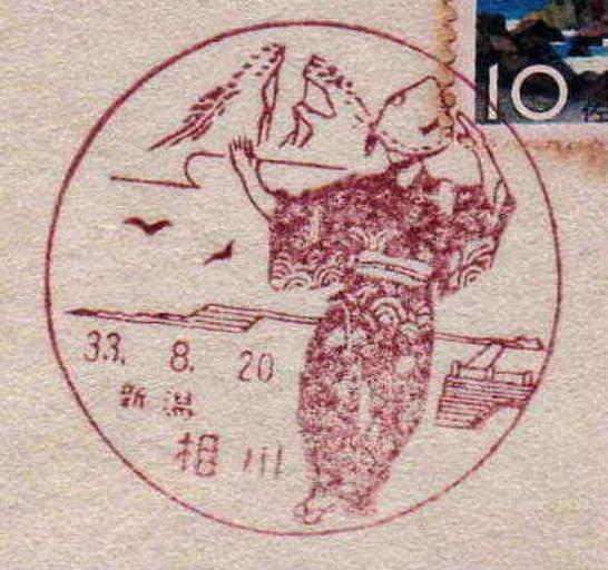 Keywords: Niigata Aikawa 33.8.20.JPG ja 新潟 の佐渡島にある相 郵便 の風景印 own stamp collection Niigata Aikawa Post Office 1958-8-20(昭和三十三年八 二十日) Landscape Postmarks of Japan PD-Japan-organization