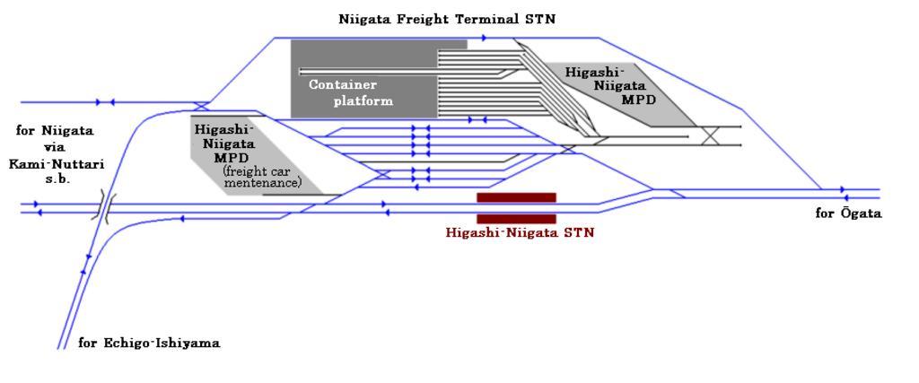 | Keywords: Niigata Freight Terminal Station Diagram EN.png en Niigata Freigth Terminal Station and Higashi-Niigata Station of Image Niigata_Freight_Terminal_Station_Diagram_JA png <nowiki/> ; 概要 ja 新潟貨物ターミナル駅構内配線図 色の線は 線( 発線を含 ) 黒色の線は側線 部の側線は 略 矢印の方向が列車の 入可能方向 ; の他 2007年貨物時刻表 を参 に ja 利用 継之助が 成 訂正・修正 頼などは ja 利用 会話 継之助へ ja Category 駅・路線配線図 Transferred from ja 画像 NigatakamotsuSta PNG 2007-08-25 Original uploader was 継之助 at http //ja wikipedia org ja wikipedia Released into the public domain by the author ja wikipedia 継之助 original upload log page ja wikipedia NigatakamotsuSta PNG 2007-08-25 09 52 継之助 900×375× 29689 bytes <nowiki>; 概要 新潟貨物ターミナル駅構内配線図 色の線は 線( 発線を含 ) 黒色の線は側線 ; の他 2007年貨物時刻表 を参 に利用 継之助が</nowiki> Rail track diagrams of train stations in Japan Niigata Freight Terminal Station Higashi-Niigata Station |