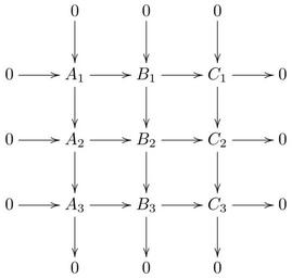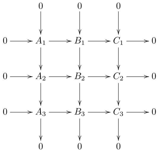 Keywords: Nine lemma.svg en A commutative diagram illustrating the nine lemma 2016-03-18 own Eeadc other versions cc-zero Category theory Complexes algebra Xy-pic diagrams