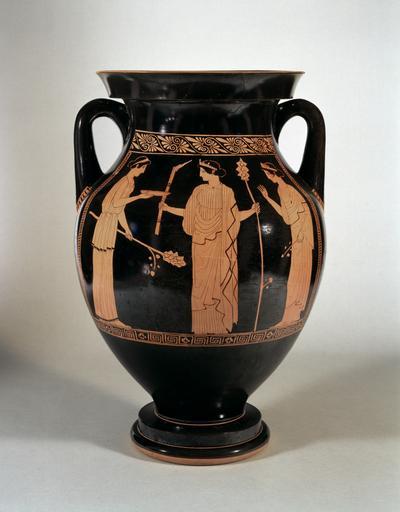 | Keywords: Niobid Painter - Red-Figure Amphora with Musical Scene - Walters 482712 - Side B.jpg One of the prominent painters of classical Athens the Niobid Painter named after his most famous vase is admired for his quiet and balanced compositions Here in the women's quarters of a house three elaborately dressed women prepare for a music session A seated woman relaxes while fingering a barbiton a stringed instrument Above her head hangs a lyre She faces a woman holding double flutes and a third woman lifts the lid of a box The scene evokes the leisured and relatively educated world of affluent Athenian women On the back women dressed in the attire of maenads the female followers of Dionysus hold pine branches and a torch; these may be the same women now preparing for their ritual roles in Dionysus' cult between 460 450 BC Classical terracotta cm 44 7 30 3 h x diam accession number 48 2712 15642 Raymond Duncan 1874-1966 brother of Isadora Duncan Dorée Duncan Seligmann granddaughter of Raymond Duncan by inheritance Robert E Hecht Jr New York 1961 mode of acquisition unknown Walters Art Museum 1993 by purchase Museum purchase 1993 Pandora's Box Women in Classical Greece The Walters Art Gallery Baltimore; Dallas Museum of Art Dallas; Antikenmuseum Basel und Sammlung Ludwig Basel 1995-1996 Highlights from the Collection The Walters Art Gallery Baltimore 1998-2001 place of origin Attica Greece Walters Art Museum license Ancient Greek red-figure pottery in the Walters Art Museum Niobid Painter Media contributed by the Walters Art Museum needs category review Maenads in ancient Greek pottery |