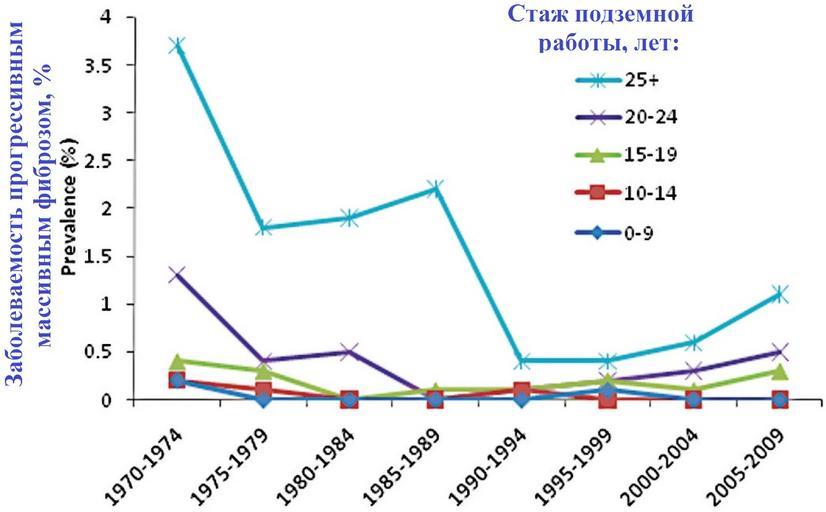 | Keywords: NIOSH-2011-08+.jpg ru Рисунок 8 из обзо а п офзаболеваний шахтё ов http //www cdc gov/niosh/docs/2011-172/pdfs/2011-172 pdf Coal Mine Dust Exposures and Associated Health Outcomes заболеваемость п ог ессивным массивным фиб озом у аме иканских шахтё ов-угольщиков за пе иод 1970-2009г в зависимости от стажа Видно что до 1999 г она снижалась а потом снова начала асти Источник NIOSH CWXSP data en Figure 8 Percentage of miners examined with PMF from the NIOSH Coal Workers X-ray Program from 1970 2009 by tenure in coal mining Source NIOSH CWXSP data 2015-04-21 http //www cdc gov/niosh/docs/2011-172/pdfs/2011-172 pdf Coal Mine Dust Exposures and Associated Health Outcomes A Review of Information Published Since 1995 Michael Attfield et al NIOSH USA other versions PD-USGov National Institute for Occupational Safety and Health Mining Workplace safety Workplace safety of Russia Occupational diseases Miners Uploaded with UploadWizard |