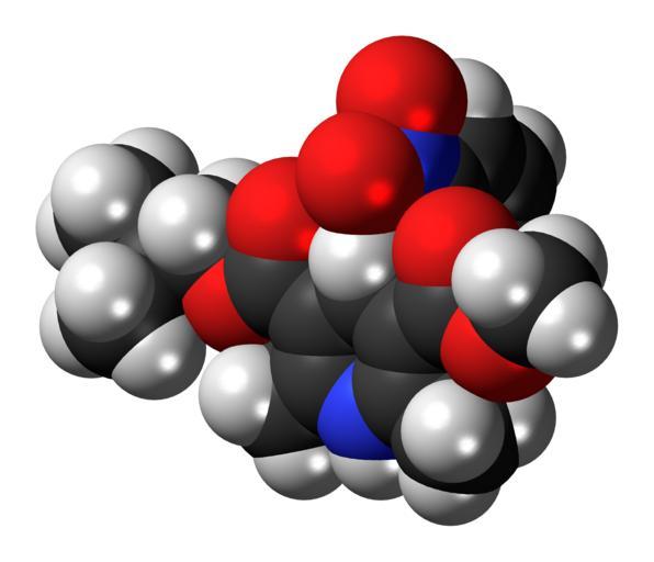 | Keywords: Nisoldipine-3D-spacefill.png Space-filling model of the nisoldipine molecule a calcium channel blocker Colour code 505050 Carbon C black<br> F0F0F0 Hydrogen H white<br> F51E1E Oxygen O red<br> 3C50FA Nitrogen N blue<br> 2011-06-13 own DS Visualizer Jynto talk Ball-and-stick version cc-zero Images by Jynto Nisoldipine |