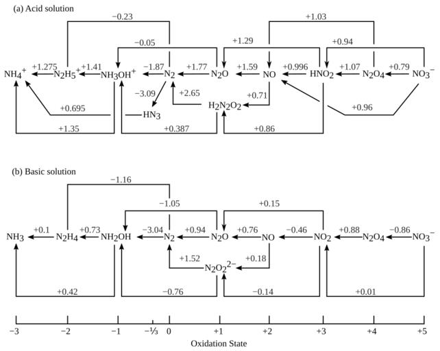 | Keywords: Nitrogen electrode potentials.svg en Shows the oxidation states of nitrogen and summarizes standard reduction potentials in volts Top diagram shows acid solution at pH 0; bottom shows basic solution at pH 14 Vector version of diagram from Cite book Chemistry of the Elements Greenwood Norman N Earnshaw Alan Butterworth-Heinemann 1997 0-08-037941-9 437 Original Diagram Norman N Greenwood and Alan Earnshaw Vectorization by AntiCompositeNumber 1997 en File Nitrogen electrode potentials png v en image SVG diagrams in English SVG chemistry Cc-zero |