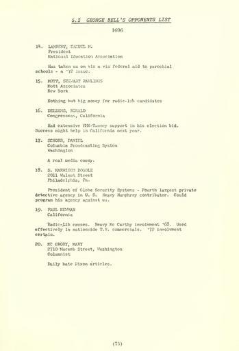 Keywords: Nixon-opponents-3.jpg Page 3 of Nixon's Enemies List compiled by George T Bell Text U S House of Representatives Resolution 803 adopted 410-4 on 6 February 1974 18 42 8 March 2010 UTC U S House of Representatives and George T Bell http //www archive org/details/statementofinfor08unit H Res 803 via archive org PD-USGov 14 LAMBERT SAMUEL M <br> President<br> National Education Association<br> Has taken us on vis a vis federal aid to parochial schools a ™72 issue <p> <p> 15 MOTT STEWART RAWLINGS<br> Mott Associates<br> New York<br> Nothing but big money for radic-lib candidates <p> <p> 16 DELLUMS RONALD<br> Congressman California<br> Had extensive EMK-Tunney support in his election bid Success might help in California next year <p> <p> 17 SCHORR DANIEL<br> Columbia Broadcasting System<br> Washington<br> A real media enemy <p> <p> 18 S HARRISON DOGOLE<br> 2011 Walnut Street<br> Philadelphia Pa <br> President of Globe Security Systems fourth largest private detective agency in U S Heavy Humphrey contributor Could program his agency against us <p> <p> 19 PAUL NEWMAN<br> California<br> Radic-lib causes Heavy McCarthy involvement ™68 Used effectively in nationwide T V commercials ™72 involvement certain <p> <p> 20 MC GRORY MARY<br> 2710 Macomb Street Washington<br> Columnist<br> Daily hate Nixon articles <p> Original upload log en wikipedia Billinghurst CommonsHelper page en wikipedia Nixon-opponents-3 jpg 2010-03-08 18 42 Jokestress 674×988× 203842 bytes <nowiki> Page 3 of Nixon's Enemies List compiled by George T Bell U S House of Representatives Resolution 803 adopted 410-4 on 6 February 1974 ~~~~~ U S House</nowiki> Watergate scandal Walnut Street Philadelphia 2011 Nixon's Enemies List |