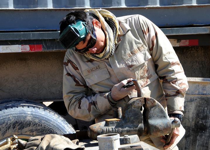 | Keywords: NMCB 7 at Forward Operating Base Mescall 120229-N-SD610-007.jpg en Steelworker Constructionman Adrian Macias assigned to Naval Mobile Construction Battalion 7 ™s Water Well Detachment fabricates metal to repair a broken ladder at Forward Operating Base Mescall NMCB 7 and its detachments are one of two Seabee battalions conducting contingency construction and deconstruction in support of the International Security Assistance Force as part of Task Force Stethem operating in the U S Central Command area of operation 2012-02-29 Chief Petty Officer Yan Kennon https //www dvidshub net/image/535669 120229-N-SD610-007 2012-03-05 22 36 ZABUL PROVINCE AF PD-USGov-Military-Navy Zabul Province Images from DoD uploaded by Fæ |