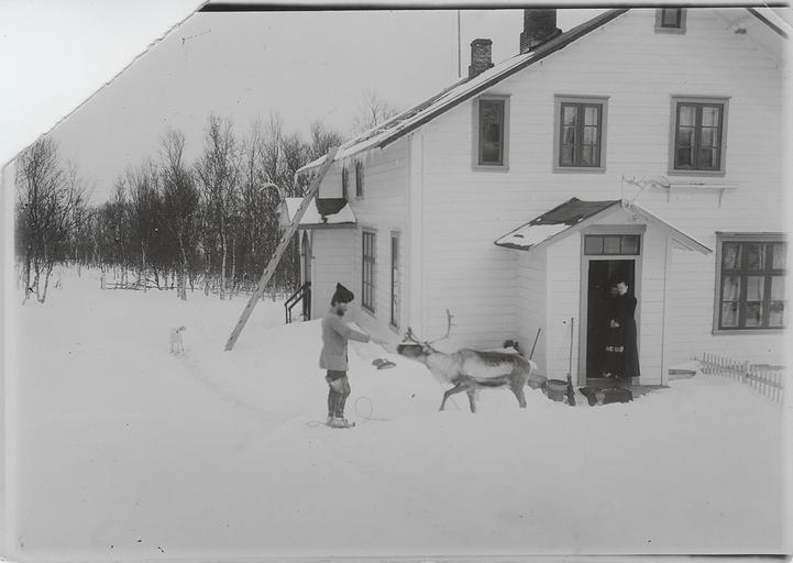 Keywords: wessel ellisif preus museum preusmuseum architecture building blackandwhite snow monochrome outdoor black and white Wessel, Ellisif Rannveig Mann med reinsdyr foran hus på Solheim. NMFF.002130 Wessel, Ellisif Rannveig Mann med reinsdyr foran hus på Solheim. NMFF.002130
