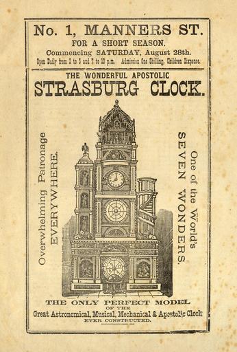 | Keywords: text ancient Shows a picture of the 12-foot high ornate clock, with painted panels, "the only perfect model of the great astronomical, musical, mechanical & apostolic clock ever constructed". The text inside describes the clock in detail (it featured St Peter and the Devil, Copernicus, and its constructor J B Schwilque), and gives the history of its construction. Quantity: 1 b&w photo-mechanical print(s) on folded leaflet.. Physical Description: Letterpress on front of leaflet, 245 x 174 mm. Search dates: 1886 - 1886    No 1, Manners St, for a short season commencing Saturday August 28th. The wonderful apostolic Strasburg clock. [1886?]. [Ephemera, pamphlets and booklets relating to clocks and watches, watch repair, time-keeping, time zones and daylight saving. 1800-2000s]. Ref: Eph-A-CLOCKS-1886-01. Alexander Turnbull Library, Wellington, New Zealand. natlib.govt.nz/records/23247781 Shows a picture of the 12-foot high ornate clock, with painted panels, "the only perfect model of the great astronomical, musical, mechanical & apostolic clock ever constructed". The text inside describes the clock in detail (it featured St Peter and the Devil, Copernicus, and its constructor J B Schwilque), and gives the history of its construction. Quantity: 1 b&w photo-mechanical print(s) on folded leaflet.. Physical Description: Letterpress on front of leaflet, 245 x 174 mm. Search dates: 1886 - 1886    No 1, Manners St, for a short season commencing Saturday August 28th. The wonderful apostolic Strasburg clock. [1886?]. [Ephemera, pamphlets and booklets relating to clocks and watches, watch repair, time-keeping, time zones and daylight saving. 1800-2000s]. Ref: Eph-A-CLOCKS-1886-01. Alexander Turnbull Library, Wellington, New Zealand. natlib.govt.nz/records/23247781 |