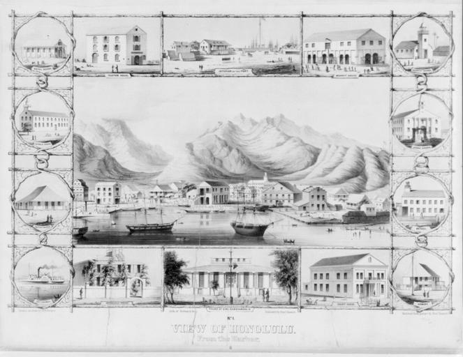 | Keywords: No. 1. View of Honolulu. From the harbor. (c. 1854, copy negative version).jpg George Henry Burgess ; lithographed by Britton Rey; sketched and published by Paul Emmert Creator George Henry Burgess Creator Paul Emmert A drawing of views of clockwise from top left the w Royal School Hawaii Royal School Custom House interior of the Fort market house charity school stone church Bethel Bethel Church armory court house palace of King Kamehameha III Honolulu House the steamer Akamai the native church and the Catholic church cite news Warren Goodale 10 Honolulu in 1853 Papers of the Hawaiian Historical Society Hawaiian Historical Society 1897 http //hdl handle net/10524/969 ca 1854 Lithography Lithograph one tint stone With text cm 51 2 69 3 ; without text cm 46 7 69 3 Institution Library of Congress Prints and Photographs Division <br> Washington D C United States accession number Call number PGA - Britton Rey--No 1 View of Honolulu D size P P; reproduction numbers LC-DIG-pga-00315 digital file from original print LC-USZ62-52238 b w film copy neg object history Published in San Francisco by Paul Emmert credit line Drawn on stone by G H Burgess / Lith of Britton Rey / Published by Paul Emmert / No 1 VIEW OF HONOLULU From the Harbor http //www loc gov/pictures/item/2003681551/ http //lcweb2 loc gov/service/pnp/pga/00300/00315v jpg cph 3b00222 other versions 100x100px George Henry Burgess No 1 View of Honolulu From the harbor c 1854 jpg PD-Art-100 Paul Emmert George Henry Burgess Hawaii in drawings 1853 in Hawaii Historical images of Honolulu Hawaii |