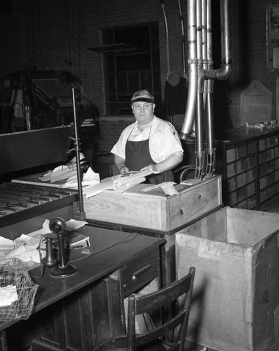 Keywords: blackandwhite monochrome black and white From the September 3, 1938 issue of the News and Observer: "Foreman of the composing room of The News and Observer for 18 years, stocky, red headed Ellis Speer, a native of Winston-Salem, was apprenticed 37 years ago at the age of 12 and has carried his union card since he was 17 years old. Designer of the new composing room, best lighted and one of the best arranged in the United States, Speer was foreman of the Winston-Salem Journal's composing room before he was 21 years old. He also served eight years as foreman of The Greensboro News before coming to Raleigh." From the N&O negative collection, State Archives of North Carolina, Raleigh, NC. Photo copyrighted by the Raleigh News and Observer. Illegal to use without express permission from the N&O. From the September 3, 1938 issue of the News and Observer: "Foreman of the composing room of The News and Observer for 18 years, stocky, red headed Ellis Speer, a native of Winston-Salem, was apprenticed 37 years ago at the age of 12 and has carried his union card since he was 17 years old. Designer of the new composing room, best lighted and one of the best arranged in the United States, Speer was foreman of the Winston-Salem Journal's composing room before he was 21 years old. He also served eight years as foreman of The Greensboro News before coming to Raleigh." From the N&O negative collection, State Archives of North Carolina, Raleigh, NC. Photo copyrighted by the Raleigh News and Observer. Illegal to use without express permission from the N&O. |