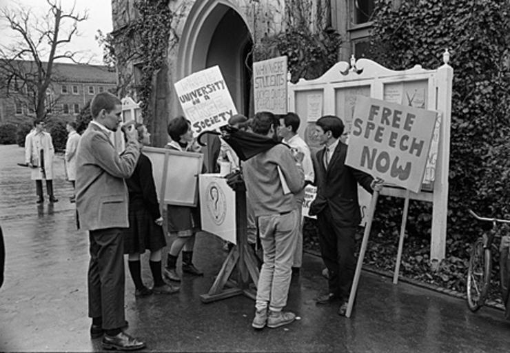 Keywords: blackandwhite monochrome black and white On June 26, 1963, the North Carolina General Assembly passed the Act to Regulate Visiting Speakers, later known as the Speaker Ban Law. The law forbade anyone to speak on a University of North Carolina campus who was a known member of the Communist Party, was known to advocate overthrow of the United States Constitution, or had invoked the Fifth Amendment in respect of communist or "subversive" connections. The law was rushed through in the closing hours of the legislative session with virtually no debate. Governor Terry Sanford was against the Speaker Ban bill, but at that time the governor of North Carolina could not veto legislation. In the wake of the passage of this law, the communities on the UNC campuses rose up in protest. Students, faculty, and community members protested the law and what it represented over the course of the next several years. A number of complex issues involving many key North Carolina political figures and national leaders kept the controversy very active and widely debated through the mid-1960's. In 1965, the North Carolina General Assembly established a commission to look into the consequenses of the law and recommend either ammedment or repeal of the law. The commission held public hearings in August and September of 1965 and in November amended the law absolving the state legislature from having to make rulings on who could speak on campuses and who could not and returning effective control over those issues to the universities. (Speaker Ban Law Study Commission records are held by the State Archives of North Carolina; finding aid is online www.archives.ncdcr.gov/findingaids/pdf/sa_speaker_ban_law...). In 1966 students at the University of North Carolina at Chapel Hill led by Student Body President Paul Dickson invited Herbert Aptheker and Frank Wilkinson ('known' Communists) to speak on the campus. As expected, the university refused to allow either of the speakers to give their speeches on campus. Instead, they addressed the assembled crowd on March 2, 1966, from across the stone wall that separates the university from the town of Chapel Hill. Ultimately a federal law suit against the university and the State of North Carolina was filed by UNC students. On February 19, 1968, after two years of consideration by the Federal District Court in Greensboro, Dickson, et al. v Sitterson, et al. was decided for the plaintiffs -- the court's opinion found the Speaker Ban law and policy unconstitutional. For more information on the Speaker Ban Law, its complexities, and surrounding events, please see this online exhibit and collection www.lib.unc.edu/mss/exhibits/protests/ban.html, NCpedia entry ncpedia.org/speaker-ban-law, and www.northcarolinahistory.org/commentary/187/entry/, used in the drafting of the above description of this set of images. COPYRIGHTED BY THE RALEIGH NEWS AND OBSERVER NEWSPAPER. DO NOT USE OR PUBLISH WITHOUT EXPRESSED CONSENT FROM THE N&O. On June 26, 1963, the North Carolina General Assembly passed the Act to Regulate Visiting Speakers, later known as the Speaker Ban Law. The law forbade anyone to speak on a University of North Carolina campus who was a known member of the Communist Party, was known to advocate overthrow of the United States Constitution, or had invoked the Fifth Amendment in respect of communist or "subversive" connections. The law was rushed through in the closing hours of the legislative session with virtually no debate. Governor Terry Sanford was against the Speaker Ban bill, but at that time the governor of North Carolina could not veto legislation. In the wake of the passage of this law, the communities on the UNC campuses rose up in protest. Students, faculty, and community members protested the law and what it represented over the course of the next several years. A number of complex issues involving many key North Carolina political figures and national leaders kept the controversy very active and widely debated through the mid-1960's. In 1965, the North Carolina General Assembly established a commission to look into the consequenses of the law and recommend either ammedment or repeal of the law. The commission held public hearings in August and September of 1965 and in November amended the law absolving the state legislature from having to make rulings on who could speak on campuses and who could not and returning effective control over those issues to the universities. (Speaker Ban Law Study Commission records are held by the State Archives of North Carolina; finding aid is online www.archives.ncdcr.gov/findingaids/pdf/sa_speaker_ban_law...). In 1966 students at the University of North Carolina at Chapel Hill led by Student Body President Paul Dickson invited Herbert Aptheker and Frank Wilkinson ('known' Communists) to speak on the campus. As expected, the university refused to allow either of the speakers to give their speeches on campus. Instead, they addressed the assembled crowd on March 2, 1966, from across the stone wall that separates the university from the town of Chapel Hill. Ultimately a federal law suit against the university and the State of North Carolina was filed by UNC students. On February 19, 1968, after two years of consideration by the Federal District Court in Greensboro, Dickson, et al. v Sitterson, et al. was decided for the plaintiffs -- the court's opinion found the Speaker Ban law and policy unconstitutional. For more information on the Speaker Ban Law, its complexities, and surrounding events, please see this online exhibit and collection www.lib.unc.edu/mss/exhibits/protests/ban.html, NCpedia entry ncpedia.org/speaker-ban-law, and www.northcarolinahistory.org/commentary/187/entry/, used in the drafting of the above description of this set of images. COPYRIGHTED BY THE RALEIGH NEWS AND OBSERVER NEWSPAPER. DO NOT USE OR PUBLISH WITHOUT EXPRESSED CONSENT FROM THE N&O.