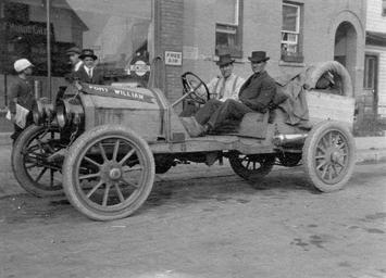 Keywords: thunder bay thunderbay port arthur portarthur fort william fortwilliam duluth cars automobiles driving road trip roadtrip transportation ontario canada history cadillac central garage centralgarage blackandwhite monochrome wheel vehicle bike black and white Date: 21 August 1915 Description: In 1915 there wasn't any road between Thunder Bay and Duluth. That didn't stop W.H. Foote, R. Blanchard, and Bert Skeels (accompanied by their plucky dog) from making the trip. This photograph shows the intrepid team in front of Central Garage on Park Street at the beginning of their journey. For five days, the men traveled over land, through heavy bush, and across streams and creeks to reach their destination. In addition to their provisions, these men carried with them several spare tires, shovels, pick axes, and other useful tools to help them along their journey. The hood of their 1911 Cadillac sported two pennants - one with "Fort William" written on it, the other "Port Arthur". Accession No.: 972.16.3 Date: 21 August 1915 Description: In 1915 there wasn't any road between Thunder Bay and Duluth. That didn't stop W.H. Foote, R. Blanchard, and Bert Skeels (accompanied by their plucky dog) from making the trip. This photograph shows the intrepid team in front of Central Garage on Park Street at the beginning of their journey. For five days, the men traveled over land, through heavy bush, and across streams and creeks to reach their destination. In addition to their provisions, these men carried with them several spare tires, shovels, pick axes, and other useful tools to help them along their journey. The hood of their 1911 Cadillac sported two pennants - one with "Fort William" written on it, the other "Port Arthur". Accession No.: 972.16.3 |