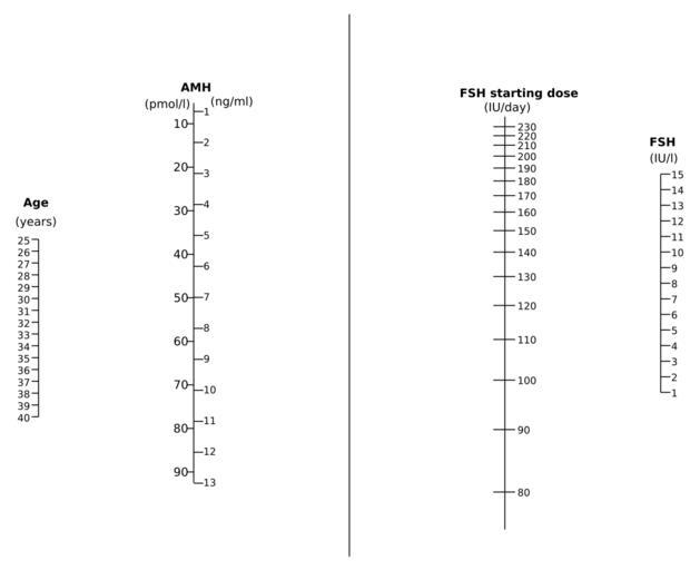 | Keywords: Nomogram for FSH dosage by AMH.svg ovarian hyperstimulation of FSH as calculated from age AMH and pre-treatment FSH level own from following source for information Cite journal La Marca A Sunkara S K 10 1093/humupd/dmt037 Individualization of controlled ovarian stimulation in IVF using ovarian reserve markers From theory to practice Human Reproduction Update 20 124 2013 Mikael Häggström 2013-12-04 thumb left png-format Cc-zero Infertility | ||||