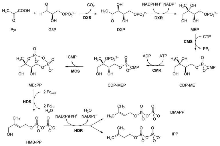 Keywords: Non-mevalonate pathway.svg en the non-mevalonate pathway overview de der Methylerithritolphosphatweg own Yikrazuul 24 November Biosyntheses Hemiterpenes Organophosphates