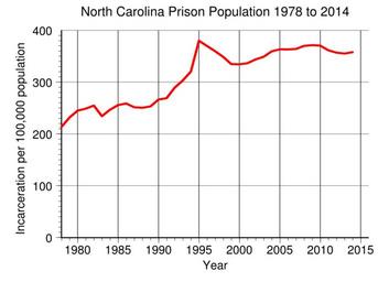 Keywords: North Carolina Prison Population.svg en North Carolina prison incarceration rate per 100 000 population from 1978 to 2014 Data from http //www bjs gov/index cfm ty nps BJS 2016-05-11 own Delphi234 other versions current annually Generated with Wikimedia SVG Chart SVG Chart/box cc-zero Prisons in North Carolina Imprisonment and detention rates in the United States |