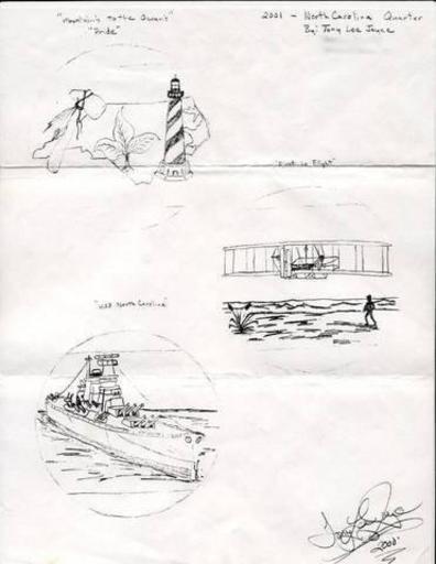 | Keywords: North Carolina Quarter Design First Flight.jpg Artwork designed for North Carolina State Quarter by Tony Lee Joyce Tbonevoodoo in 2000 and was picked by Governor James B Hunt as the design for the First In Flight 50 State quarters Redesigned by the United States Mint and engraved by John Mercanti Governor James B Hunt appointed the North Carolina Department of Cultural Resources as the lead in the state's design concept process The Department established the North Carolina Commemorative Coin Committee which consisted of members from the State Department of Cultural Resources the Division of Archives and History as well as coin collectors The Committee solicited design ideas from the residents of North Carolina Some alternate design concepts suggested were the 1903 Flyer superimposed over an outline of the state the Hatteras Lighthouse superimposed over an outline of the state and the Hatteras Lighthouse showing a dune and sea gulls On June 5 2000 the Governor was provided with three candidate designs and the Committee and Governor Hunt selected the First Flight theme for the official design This design and two others were sent in by Artist Tony Lee Joyce a resident of Stokes County N C in the year 2000 and redesigned and engraved at the United States Mint own Self 2000 Self Tbonevoodoo Artwork by Tony Lee Joyce Cape Hatteras Lighthouse Lighthouses in art |