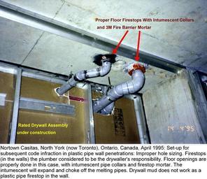 Keywords: Nortown plastic pipe drywall.jpg Set-up for subsequent code infraction When firestops are done by separate trades instead of a speciality firestop subcontractor who does all firestopping on site mechanical electrical structural and architectural a popular cost-cutting measure is for mechanical and electrical trades to absolve themselves of sealing wall openings particularly in drywall by claiming that they have hung their pipes and wires BEFORE the drywall was up and that therefore the drywaller is responsible The drywaller has no such instructions in his specification and simply butts up to the penetrants and uses common drywall mud to close the gap which is not an approved firestop With plastic piping which melts and burns quickly in a fire this is particularly dangerous When the subtrades don't allow enough money for this pre-tender on the basis of such reasoning a budgetary battle or code infractions or both are not uncommon outcomes own 2007-08-25 Achim Hering Plumbing Cement Firestops Operable firestops Firestop mortar Concrete Plastic objects Building code violations Intumescents 3M Fire Barrier Mortar FS195 |