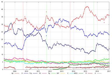 Keywords: Norwegian Storting Montly Party Polls.png en What fraction of the population would vote for each party in a Norwegian Storting election based on monthly poll data from pollofpolls no starting from 2008 The vertical light red lines mark Storting elections while the light green ones mark local elections The x axis is the year and the y axis is the popularity in percent 2016-03-29 own Amaurea other versions cc-zero Statistical charts Politics of Norway Stortinget
