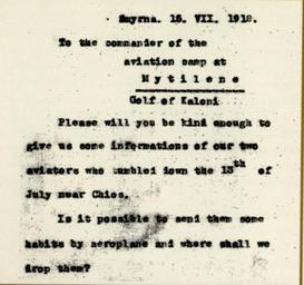 | Keywords: Note Ottoman Aviation 1918.png el Σημείωμα στα αγγλικά ου έριξαν με ερματισμένο φάκελο αερο όροι της Οθωμανικής Αερο ορίας άνω α ό τη Χίο στις 15 Ιουλίου 1918 και ζητούν ληροφορίες για την τύχη συναδέλφων τους Στο σημείωμα α άντησε ο Αριστείδης ωραϊτίνης με τον ίδιο τρό ο τις ε όμενες ημέρες 2014-12-24 Greek Air Force Museum Tatoi Athens Greece author other versions PD-old-70-1923 Uploaded with UploadWizard Hellenic Air Force Museum | ||||