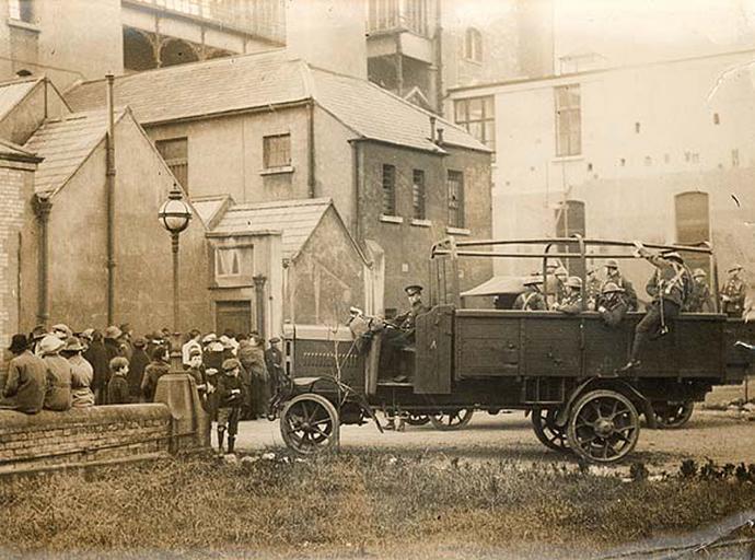 Keywords: military military enquiry militaryenquiry croke park crokepark bloody sunday bloodysunday soldiers jervis street hospital jervisstreethospital jervis street jervisstreet dublin ireland war of independence warofindependence irish war of independence irishwarofindependence november 1920 1920s twenties truck lorry w.d. hogan wdhogan hogan collection hogancollection national library of ireland nationallibraryofireland outdoor vehicle monochrome Friends of the victims and members of the military outside Jervis Street Hospital during the military enquiry into the Bloody Sunday shootings at Croke Park on Sunday, 21 November 1920. Monday's Irish Independent reported what had happened under the headline Raid on Football Match: "Terrifying scenes were witnessed yesterday at Croke Park when, during the progress of a challenge football match between teams representing Dublin and Tipperary, military, R.I.C., and auxiliary police made their appearance. Volleys of rifle fire were heard, and 15,000 spectators fled in a desperate attempt to escape. The casualties total 12 killed, 11 seriously wounded, and 54 others injured. An official account states the Crown forces went to seek persons concerned in the shootings yesterday morning, and alleges that pickets raised an alarm and fired on the approaching forces, the fire being returned. There were most painful scenes subsequently when the dead, who include one of the Tipperary players, and wounded were picked up and removed to hospital." Date: 24 November 1920 NLI Ref.: HOG161 Friends of the victims and members of the military outside Jervis Street Hospital during the military enquiry into the Bloody Sunday shootings at Croke Park on Sunday, 21 November 1920. Monday's Irish Independent reported what had happened under the headline Raid on Football Match: "Terrifying scenes were witnessed yesterday at Croke Park when, during the progress of a challenge football match between teams representing Dublin and Tipperary, military, R.I.C., and auxiliary police made their appearance. Volleys of rifle fire were heard, and 15,000 spectators fled in a desperate attempt to escape. The casualties total 12 killed, 11 seriously wounded, and 54 others injured. An official account states the Crown forces went to seek persons concerned in the shootings yesterday morning, and alleges that pickets raised an alarm and fired on the approaching forces, the fire being returned. There were most painful scenes subsequently when the dead, who include one of the Tipperary players, and wounded were picked up and removed to hospital." Date: 24 November 1920 NLI Ref.: HOG161 |