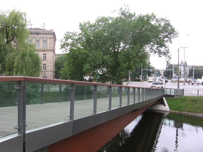 | Keywords: NowaKladkaPrzezFose.JPG pl Kładka Świebodzka przez Fosę Miejską we Wrocławiu widziana od strony północno-wschodniej z Promenady Staromiejskiej nieopodal ul Włodkowica gdzie niegdyś znajdował się Psi Bastion Za kładką - plac Orląt Lwowskich a w perspektywie widoczna oś ulicy Tęczowej <br>Wg informacji na stronie http //www mostypolskie pl/aktualnosci/nowa-kladka-dla-pieszych-we-wroclawiu 0 677 html mostypolskie pl liczy 43 35 m długości i 3 50 m szerokości w świetle balustrad Wykonana z drewna klejonego GL32C z nawierzchnią z egzotycznego afrykańskiego drewna Azobe Bongossi łac Lophira alata i balustradami z płyt szkła hartowanego; przęsło tej kładki waży ok 47 ton own Julo 2009-08-05 Julo 51 6 29 5 N 17 1 21 E region PL-DS_scale 5000_heading SW Świebodzka footbridge Lophira alata |