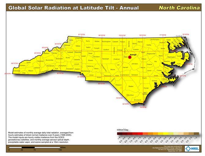 Keywords: NREL-eere-pv-northcarolina.jpg en North Carolina solar radiation at latitude tilt 2007-09-25 http //en openei org/w/index php title File NREL-eere-pv-northcarolina jpg Billy Roberts other versions PD-USGov Uploaded with UploadWizard Solar power in North Carolina |