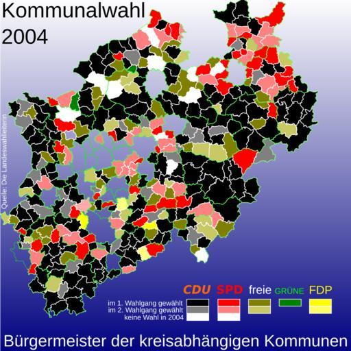 | Keywords: NRW election 2004 Gemeinden.svg en Map of the outcome of the local elections 2004 in North Rhine-Westfalia showing the party of the elected bürgermeister Mayor of the distrikt-dependent municipalities and cities de Karte mit den Ergebnis der Kommunalwahlen 2004 in Nordrhein-Westfalen Gezeigt ist die Parteizugehörigkeit der gewählten Bürgermeisters der kreisangehörigen Städte und Gemeinden own Vinom 2009-03-25 basiert auf 100px Local elections in North Rhine-Westphalia 2004 | ||||