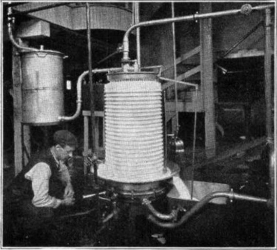 Keywords: NSRW Dairy Industry 5.jpg <small>Copyright Brown Bros </small> FILTER AND PASTEURIZER The milk is next carried to a Pasteurizer First it passes through the filter which is the upper can on the left of the picture It then passes to the Pasteurizer which you see in the center of the picture It is first warmed by being allowed to run down over the outside of the Pasteurizer and it is then forced up through the interior which contains a steam coil where it is heated to 162° Fahr This kills the germs and makes it possible to keep the milk sweet for a week It is then carried through a pipe at the top of the Pasteurizer to the cooler Next >> Image LA2-NSRW-3-0230 jpg Pasteurization |